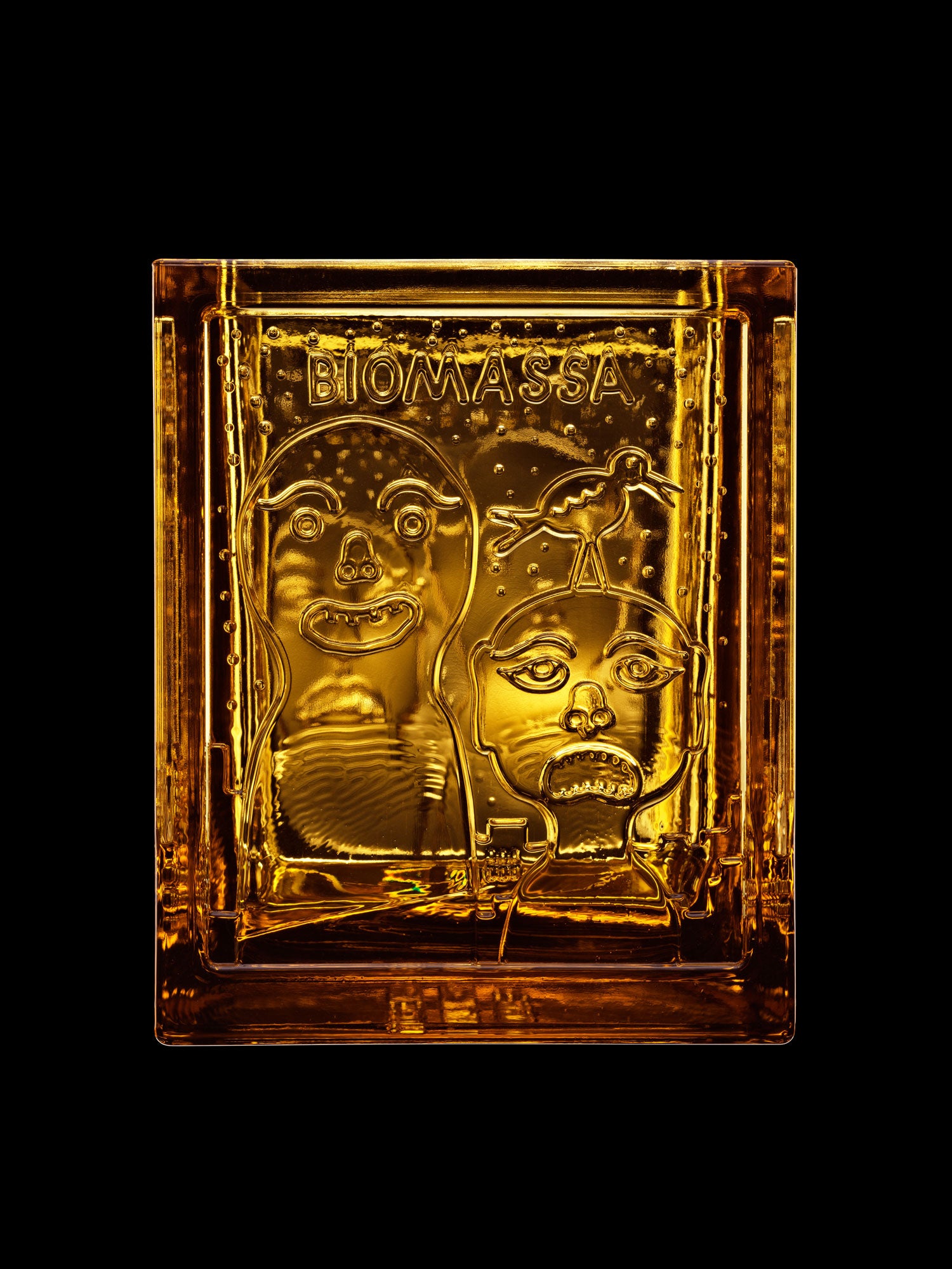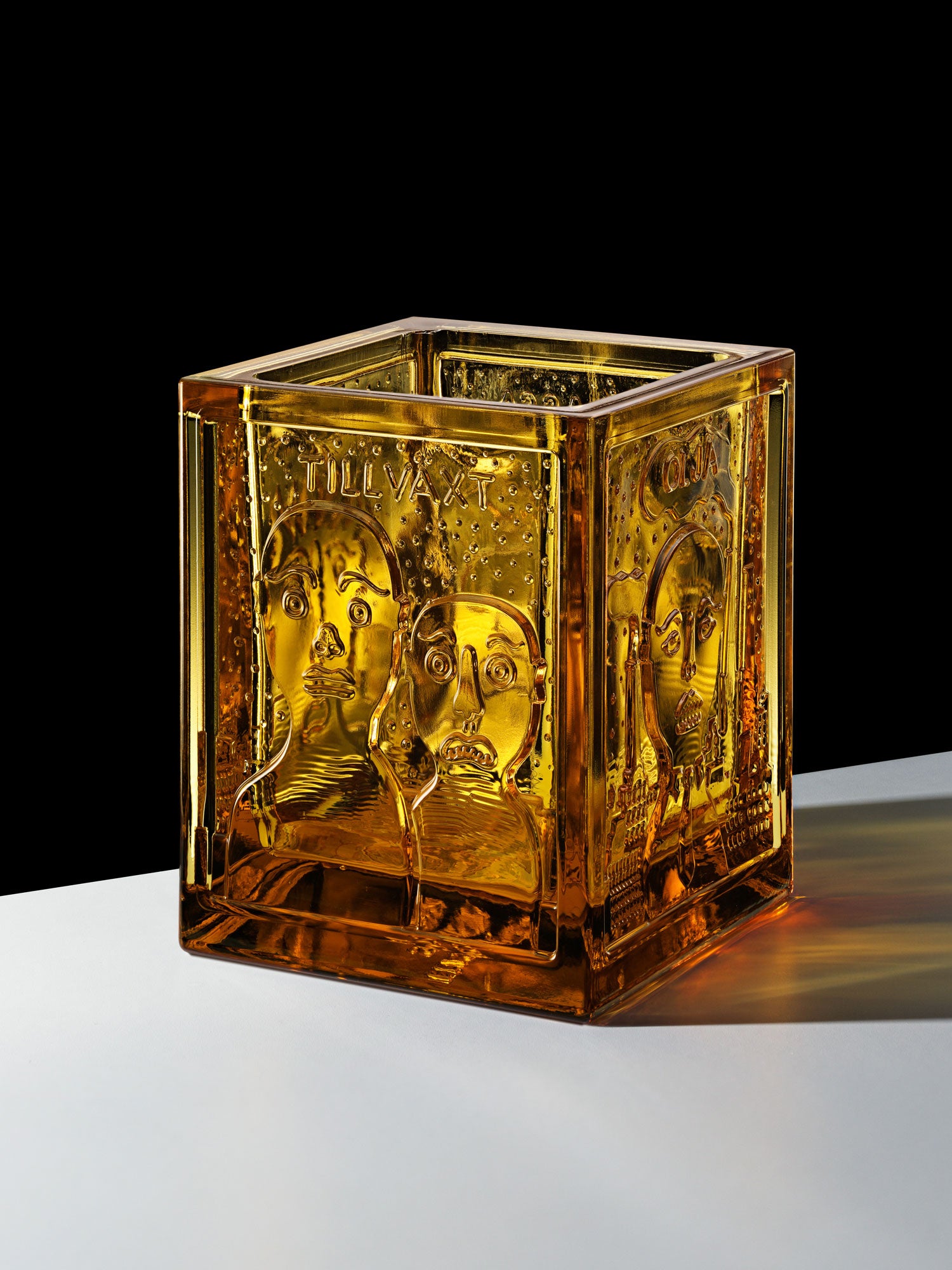 Lykta för värmeljus i pressat glas i färgen bärnsten. Dekor föreställande industrier och individer, samt orden biomassa, tillväxt, känslor och olja. Föremålet är tillverkat av Reijmyre Glasbruk och finns även i färgerna blå, vit, rosa och grön.