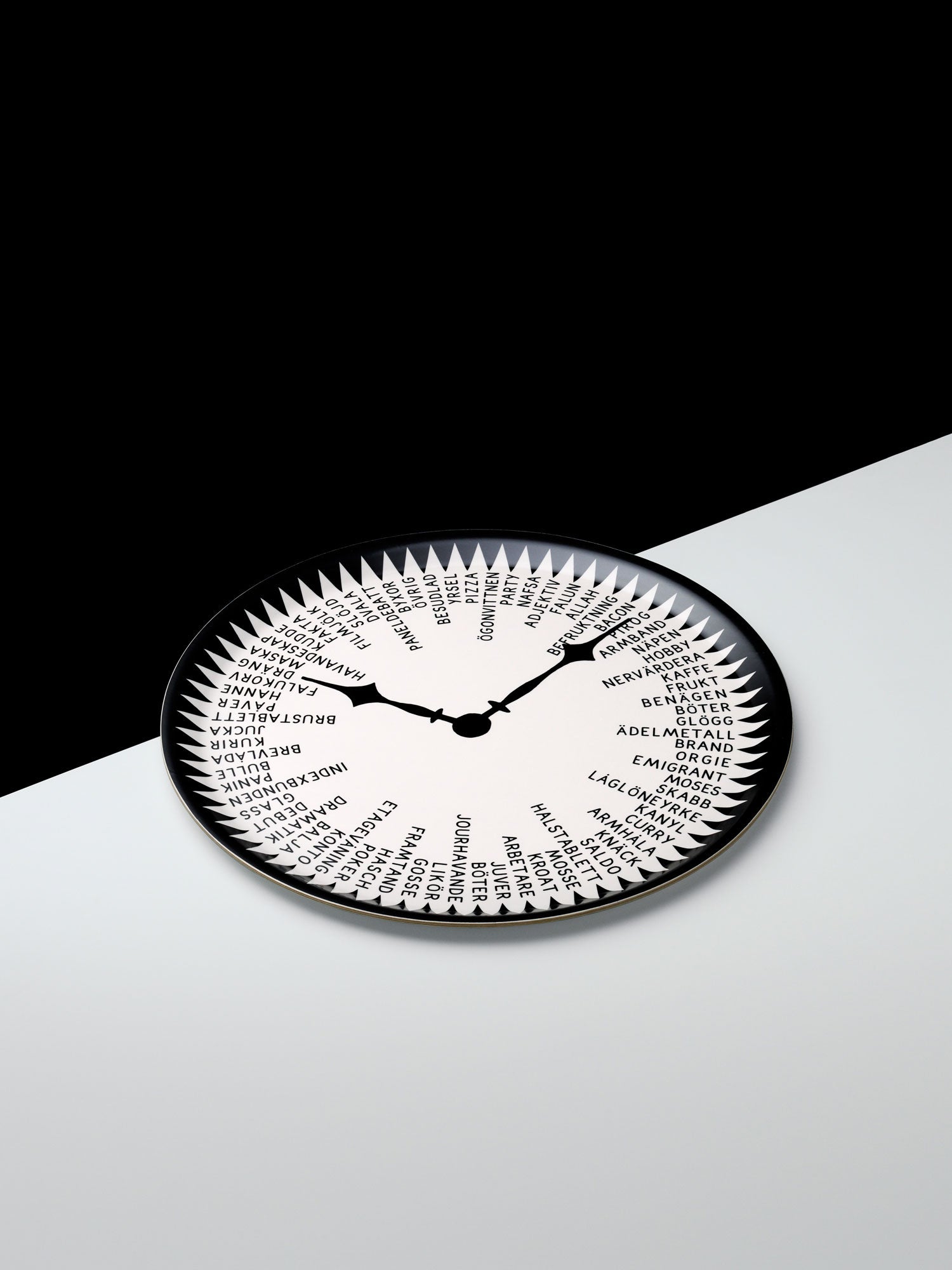 Moses, likör, befruktning, brevlåda, hobby, framtand, adjektiv och emigrant. Bricka med motiv föreställande en samhällsklocka. Brickan är tillverkad i Nybro.