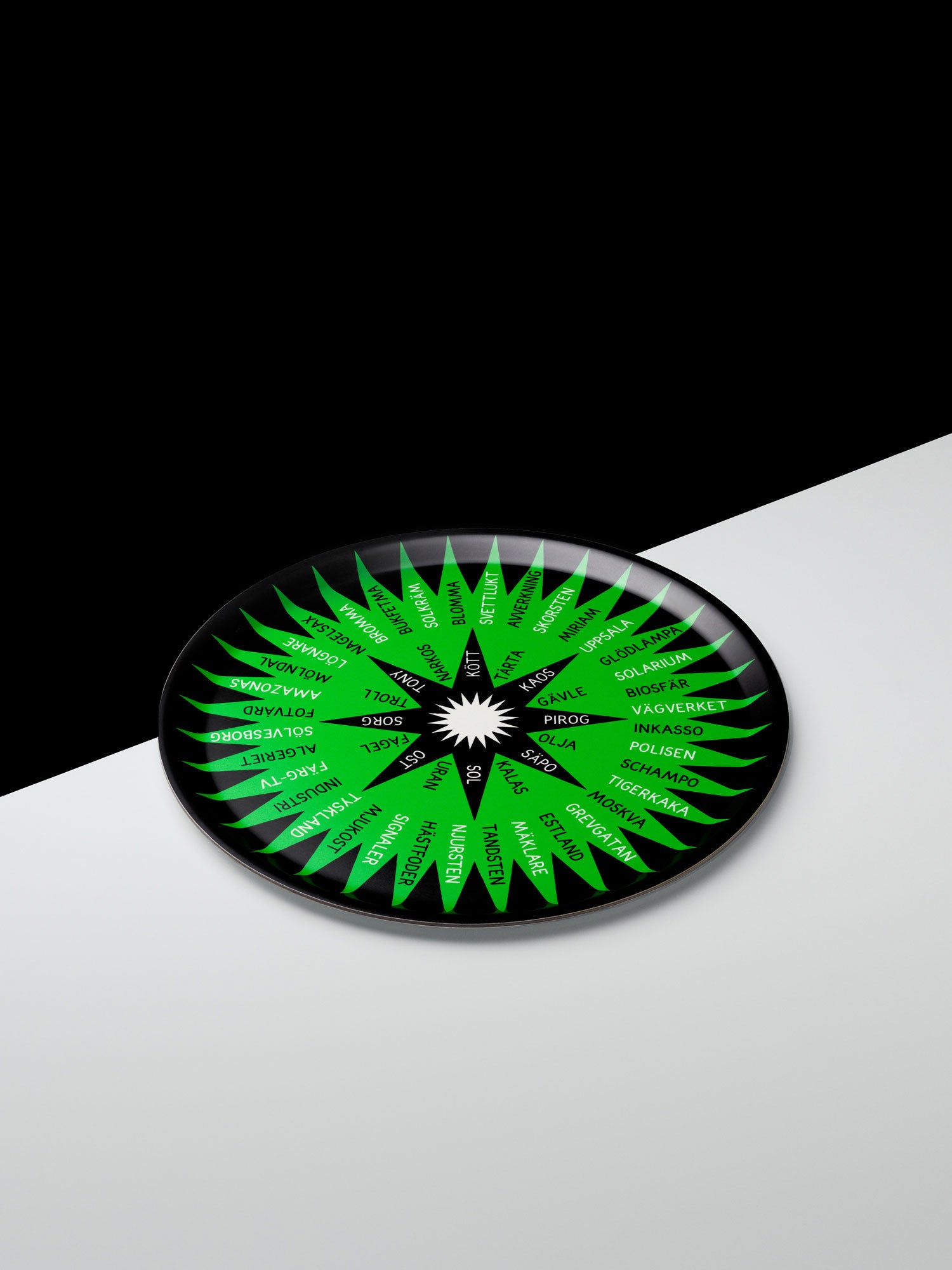 Bricka med motiv bestående av en så kallad samhällskompass, som visar riktningen till bland annat Kronofogden, Säpo, Tony, Bromma, fotvård och uran. Brickan är tillverkad i Nybro.