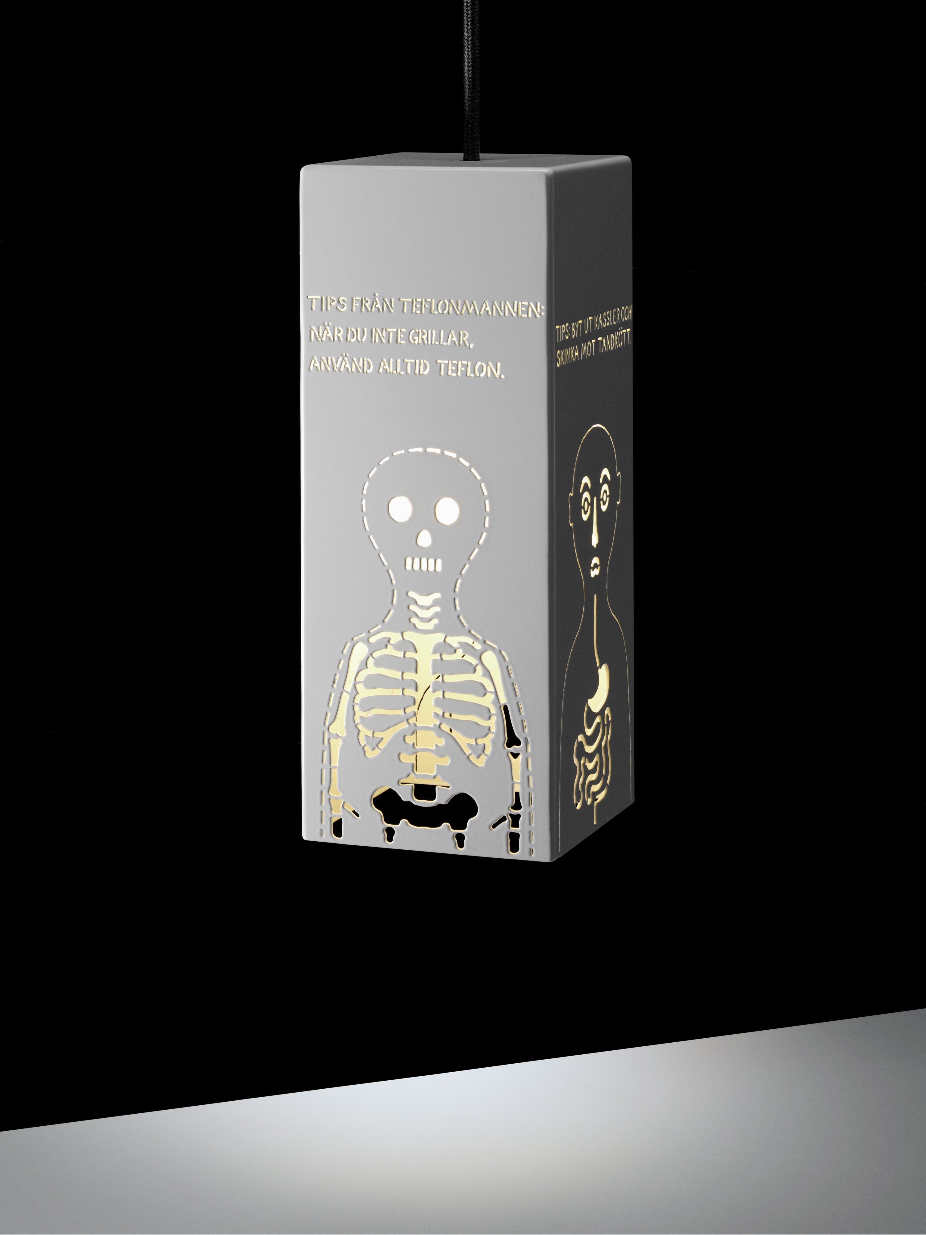 Taklampa utförd i vitlackerad perforerad metall. Armaturen finns med ett flertal olika motiv och teman. Lamporna är tillverkade i Tullinge utanför Stockholm.