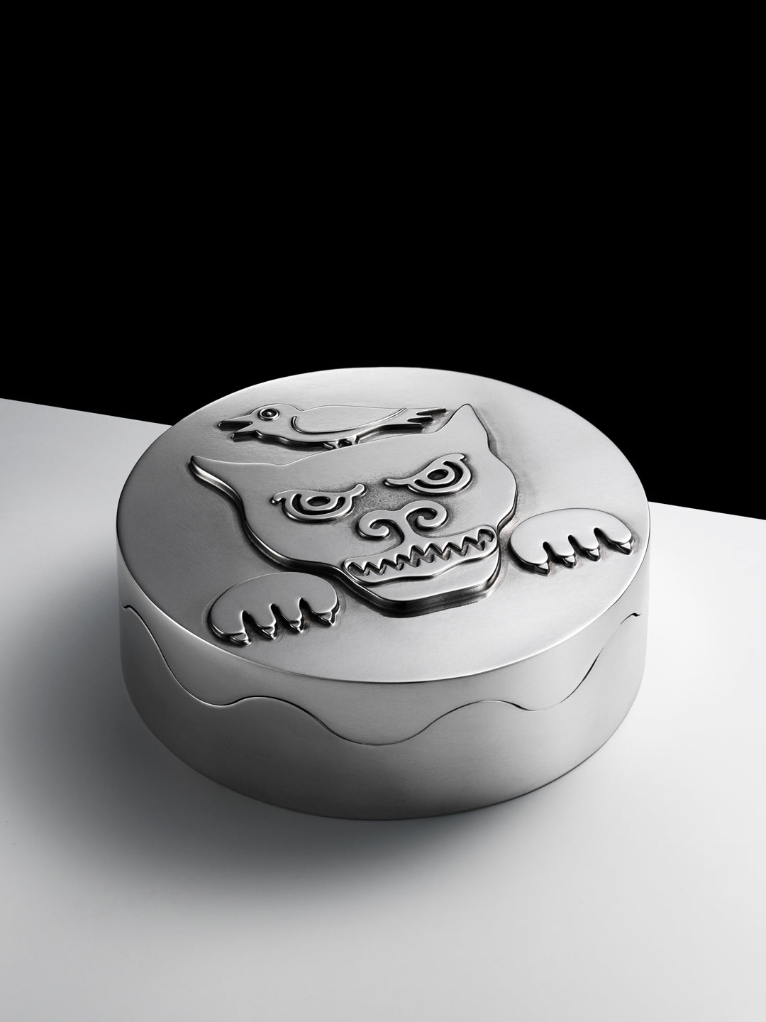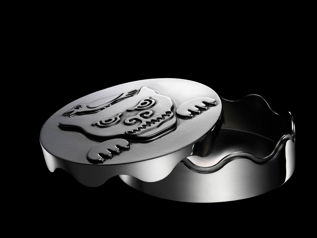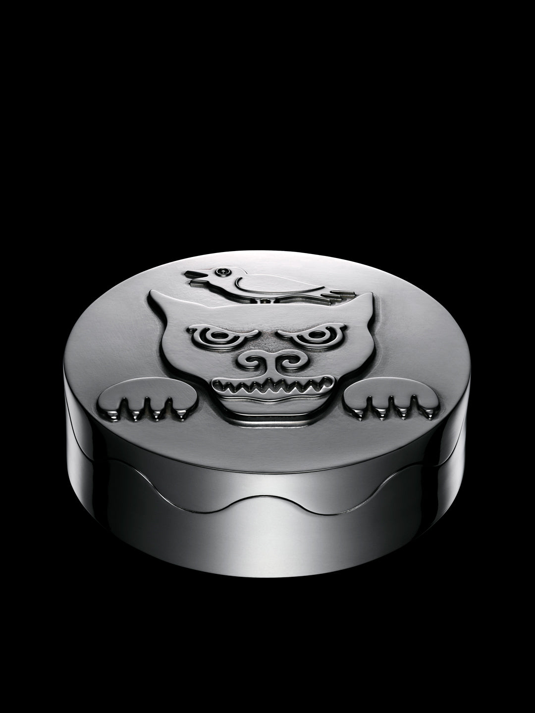 Burk med lock, dekorerad med motiv föreställande en predator. Vågformad tennfog mellan lock och underdel. Vågformen som återkommer i ett flertal av Brasserie Godots produkter är en allegori för vatten.