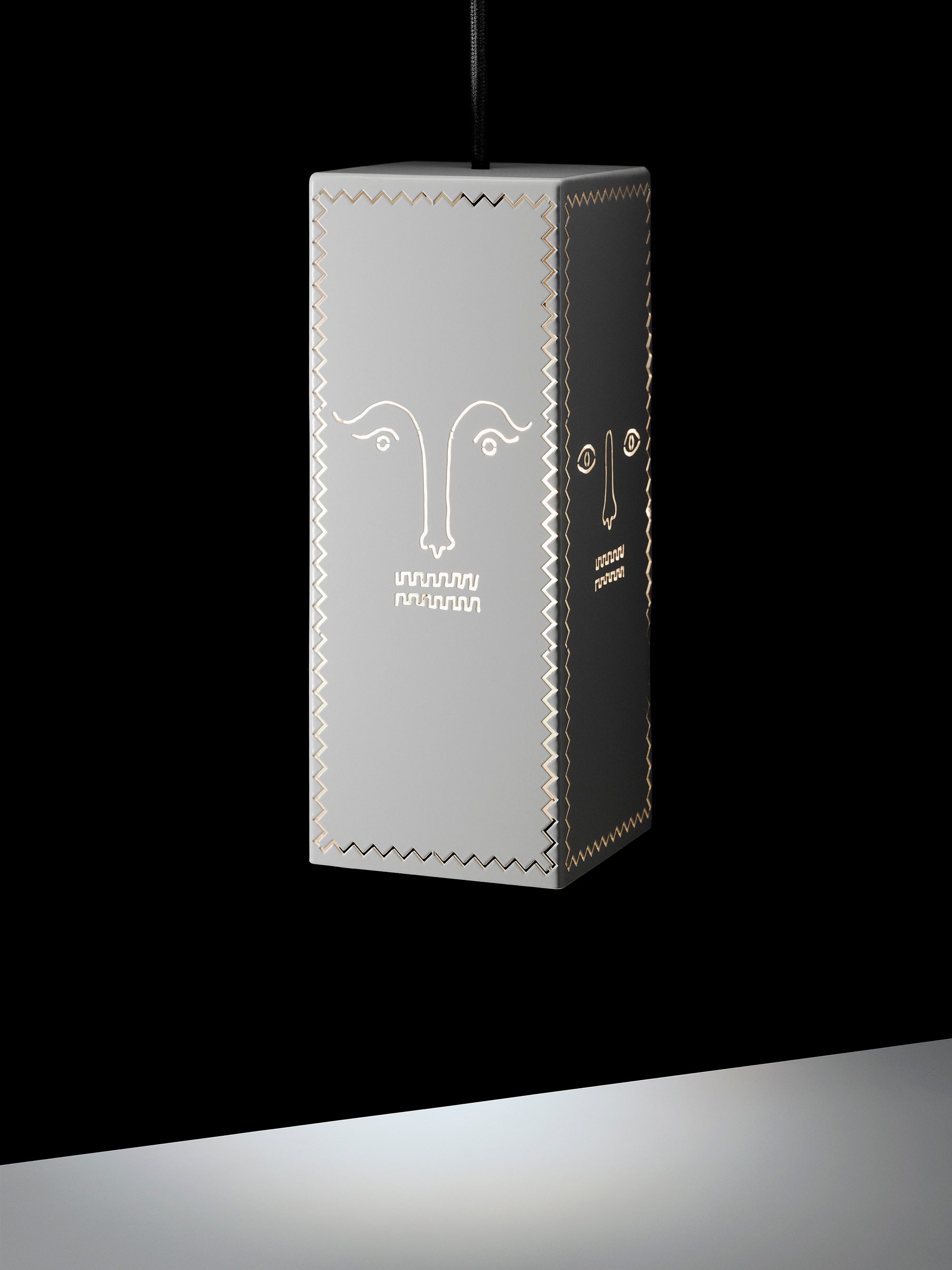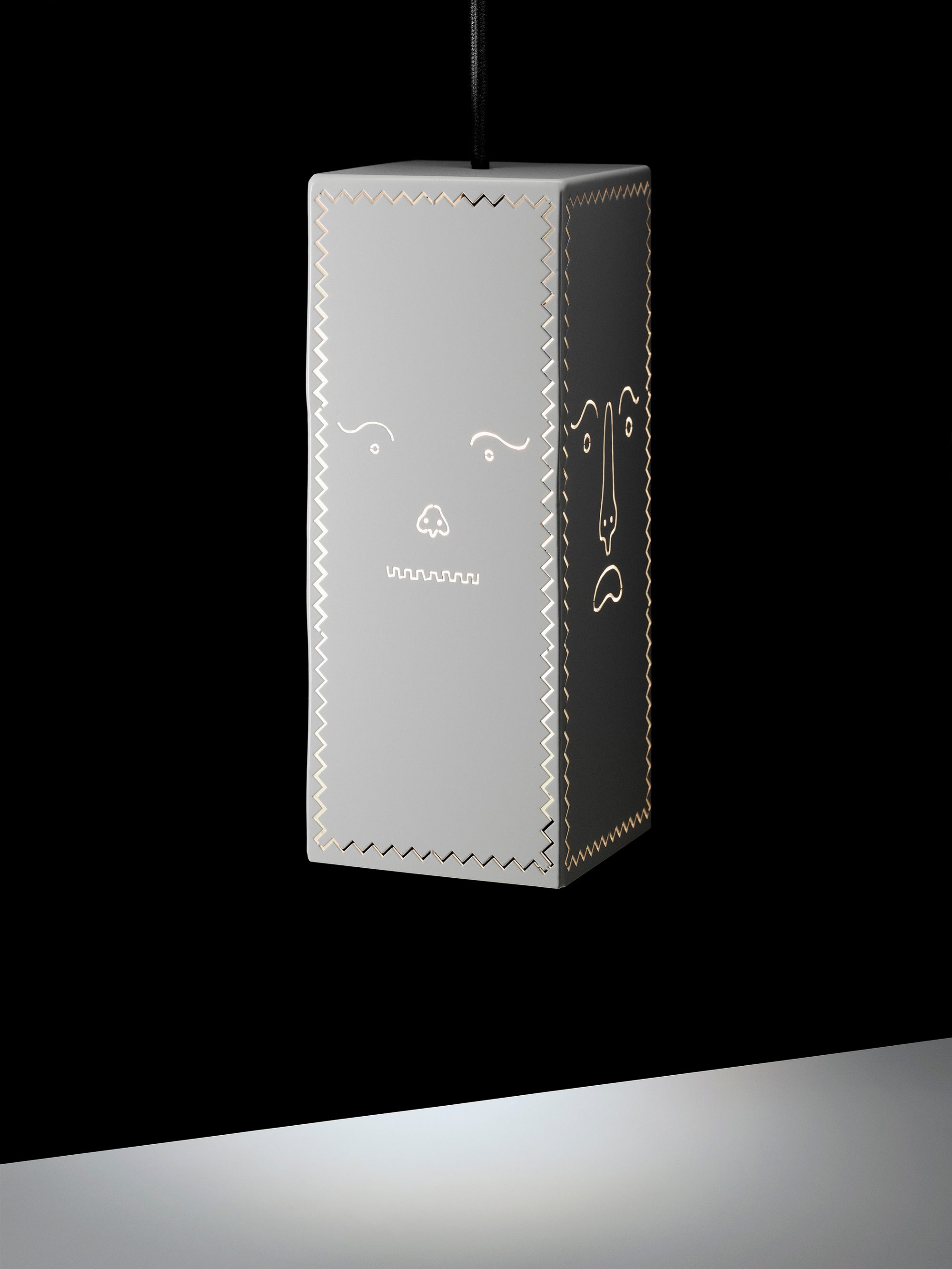 Taklampa utförd i vitlackerad perforerad metall. Armaturen finns med ett flertal olika motiv och teman. Lamporna är tillverkade i Tullinge utanför Stockholm.
